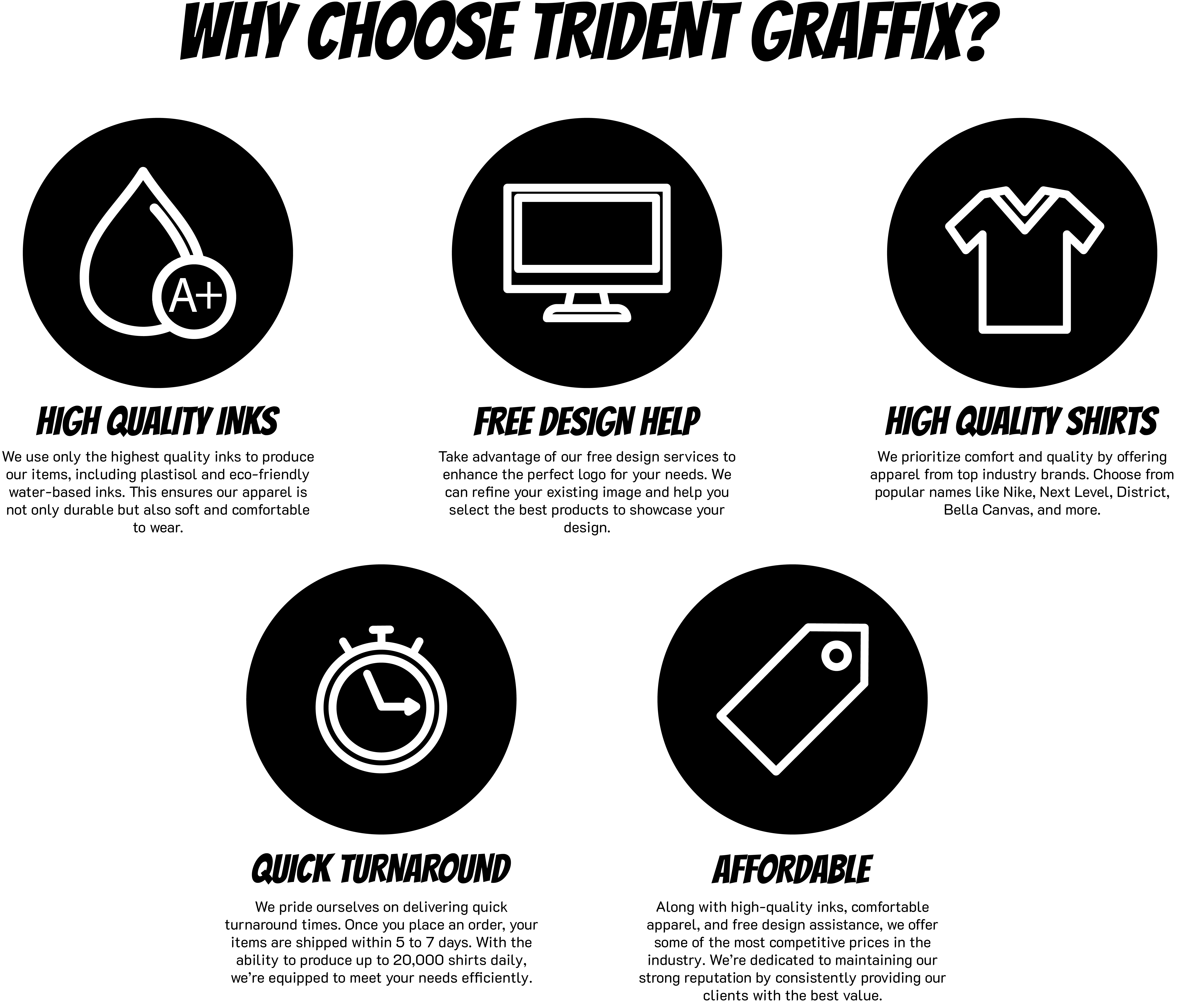 Trident Graffix makes it easy for businesses, organizations, and individuals to launch their own online store or sell merchandise without the burden of overhead costs. With our merch store services, you can design and sell custom apparel online without worrying about inventory management. We handle the printing, packing, and shipping, so you can focus on growing your brand.